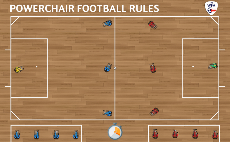 The goal posts are 6m apart and unique Powerchair Football goal posts are used for safety.
